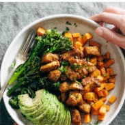 - Carbs: Sweet potatoes! So filling and so satisfying – regular potatoes would work too.